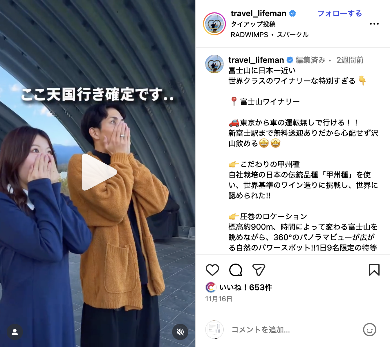 Instagram・TikTokでインフルエンサー動画を投稿。多ジャンルの起用により潜在顧客層へリーチし、ワイナリーの認知拡大と集客に貢献。